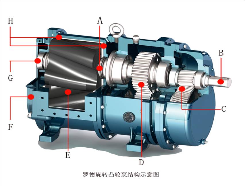 A—機(jī)械密封;B—軸;C—減速齒輪;D—同步齒輪;E—轉(zhuǎn)子;F—快開(kāi)式泵蓋;G—軸承;H—耐磨襯板